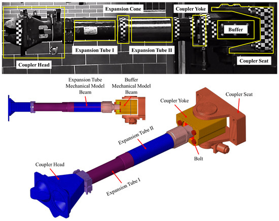 The numerical simulations were performed employing a finite element model constructed in LS-DYNA. As shown in Figure 9, the structure of the train coupler mainly included the coupler head, expansion tube, buffer, cut-out induced bolts, coupler yoke, and coupler seat. To simplify the calculation of the model, beam elements were used to simulate the dynamic characteristics of the expansion tube and buffer, and *MAT_GENERAL_NONLINEAR_6DOF_DISCRETE_BEAM (MAT_119) was selected as the material model for the beam elements. The coupler head and coupler seat underwent less deformation during collisions and were not the focus of the study, so shell elements were used for simulation, and *MAT_RIGID (MAT_020) was selected as the material model for the shell elements.