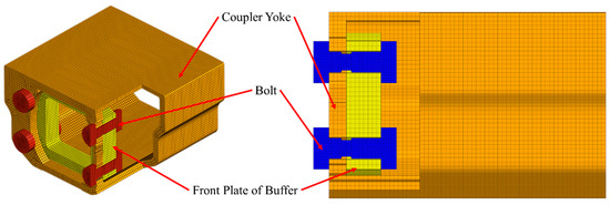 Bolts, coupler yoke, and buffer front plate were simulated using solid elements, as shown in Figure 10. The bolts used *MAT_PIECEWISE_LINEAR_PLASTICITY (MAT_024) as their material model. The buffer front plate and coupler yoke underwent less deformation during collisions and could be considered rigid bodies in the calculation process, so *MAT_RIGID (MAT_020) was selected as the material model. The connection between the buffer front plate and the buffer beam element was achieved through *CONSTRAINED_EXTRA_NODE.