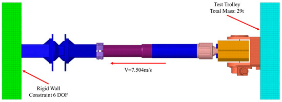 As shown in Figure 11, the finite element simulation model for the test conditions established contact relationships between the coupler heads, crushed tube, buffers, and coupler yoke using *CONTACT_AUTOMATIC_SURFACE_TO_SURFACE, and the friction coefficient was set to 0.2, referencing relevant literature [30]. Additionally, to ensure that the impact of kinetic energy remains unchanged during the collision, corresponding mass points are placed on the test trolley, and the total model mass is adjusted to match the test mass.