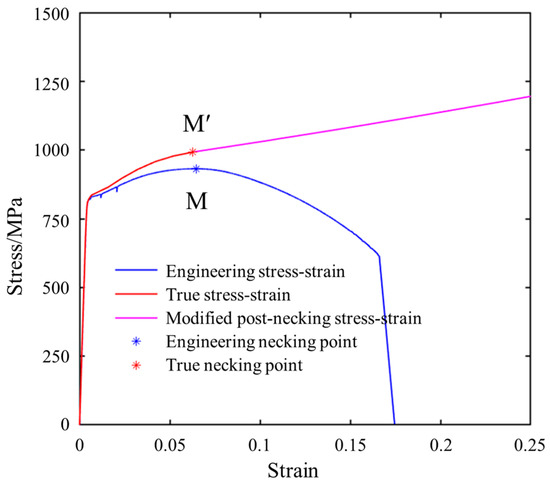 The bolt material is 40Cr and the stress–strain relationship of the 40Cr material obtained by Zhang [29] on the universal fatigue testing machine is shown in Figure 13. The blue curve represents the engineering stress–strain relationship of the 40Cr material, which is mainly based on the assumption that the cross-sectional area of the bolt does not change during the tensile process, and is obtained through Equations (1)–(3).