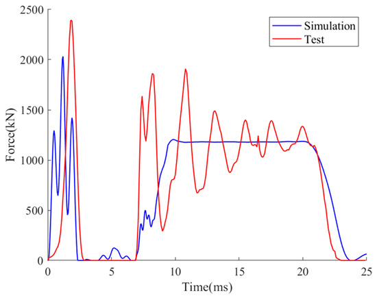 After the simulation calculation, the calculated force–time curve was compared with the force–time curve collected from the test. As can be seen from the curves in Figure 14, the time history trend of the coupler contact force is roughly similar. Additionally, as described in Section 2.1.3, due to installation errors and other reasons, there is a certain amount of free travel between the buffer and the internal components of the buffer. Therefore, during the model calibration process, a certain amount of free travel was also given to the buffer beam’s force–displacement curve to synchronize the contact force time history changes between the test and simulation.