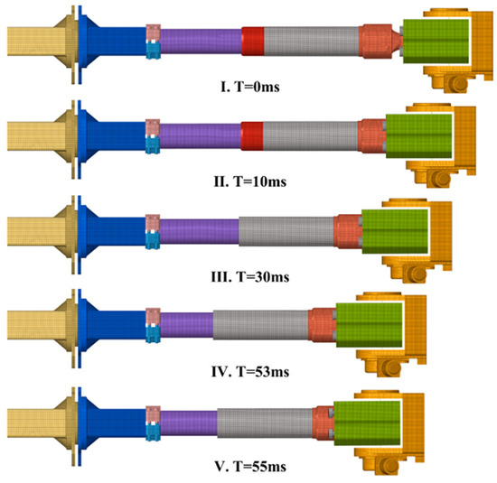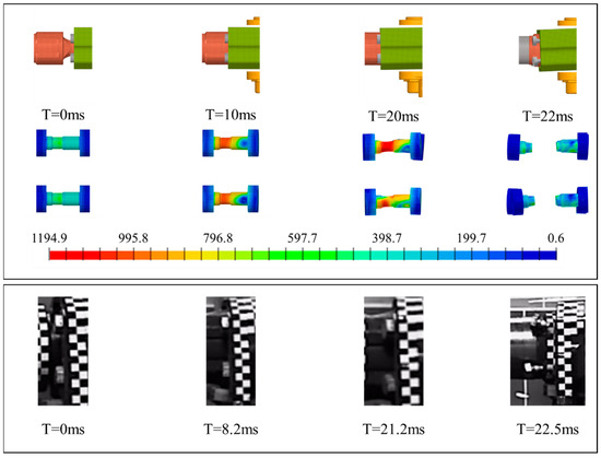 As shown in Figure 15, the deformation of the bolts in the simulation and test is as follows: when T = 0 ms, the coupler heads are fully coupled, about to generate contact force, and the bolts are in the state of being preloaded with no deformation; when T = 10 ms, under the simulation calculation, the expansion tube enters the stable crushing stage, and the bolts at the cut-out zone begin to show slight deformation; when T = 20 ms, under continuous force, the bolts at the cut-out zone continue to deform, the cross-section area decreases, and a more obvious necking phenomenon can be observed, with the bolts at the brink of breaking; at T = 22 ms, the bolts have broken, and the two parts fly apart. In summary, the bolt breaking time in the test is T = 21.2 ms, and the bolt breaking time obtained from the simulation calculation is T = 20.4 ms, with a difference of approximately 3.77%, proving the model’s validity.