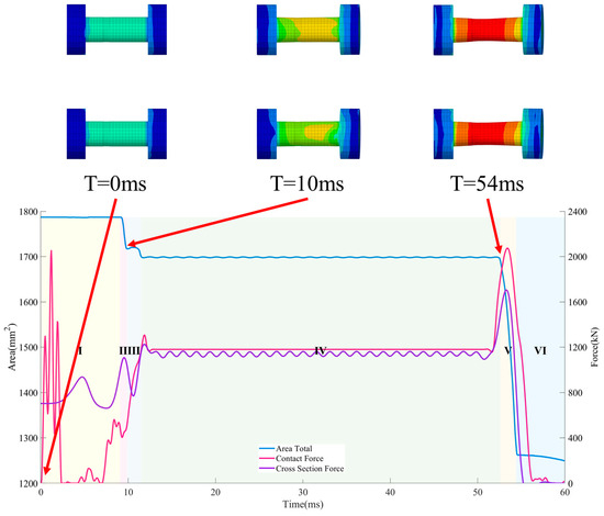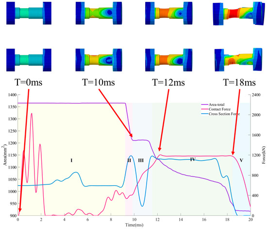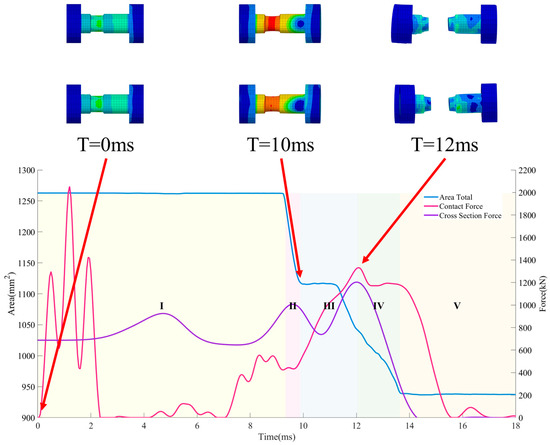 Taking the case of bolts breaking before the expansion tube starts working (the 29th set of bolt conditions in the DOE) as an example, as shown in Figure 18, the first and second stages are the same as before. However, in the third stage, after the cross-sectional force of the bolts reaches the initial peak force and starts to decline before returning to the platform force, there is still a reduction in the cross-sectional area of a certain bolt within the bolt group. Before the coupler contact force and the cross-sectional force of the bolts return to the platform force, the minimum cross-sectional area of the bolts is insufficient to withstand the load, causing a certain bolt to break, leading to the failure of the entire bolts group and prematurely entering the fifth stage, the post-fracture phase.