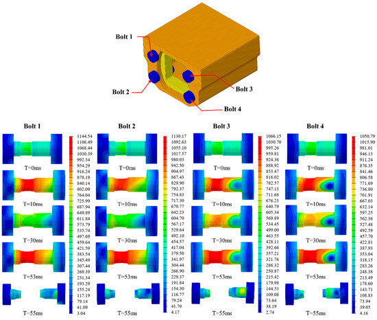 Evidently, due to the existence of inertial effects, the force on the bolts during the collision does not change synchronously with the coupler contact force. Inertial effects act as a filter and a delay throughout the process. Therefore, during the first stage, when the coupler contact force reaches the first initial peak force, the cross-sectional force of the bolts does not significantly increase but is delayed by 4–5 milliseconds, and the increase is much less than the amplitude of the initial peak force. Secondly, before entering the stable crushing phase, the bolts’ cross-section will be subjected to peak force impacts from both the shock absorber and the expansion tube (corresponding to the peak forces in stages two and three). Under the impact of the peak force, the bolts will deform, weakening their resistance to tensile forces.