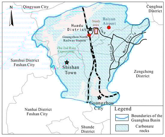 The Guanghua Basin is located in the northern part of the Pearl River Delta, with a dense river network, abundant precipitation, tectonic control by the Guangcong fault, and the tectonic pattern is dominated by the NE direction. The central and southern part of the basin is mainly composed of huge thick carbonate deposits accumulated in the Late Devonian period, and has experienced many times of transgression and crustal uplift in the geological history [37,38]. The above conditions are extremely favorable for the formation of cover karst.