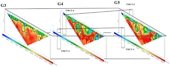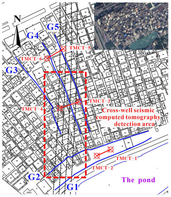 The layout diagram of the cross-well seismic computed tomography imaging survey lines is presented in Figure 3. In this study, three representative groups of profiles were selected for detection, which were TMCT 1–TMCT 2, providing the cross-well seismic computed tomography profile in the south of the urban village near the pond to verify the potential water conduction channel at 120 m of the G1–G2 line of the electrical resistivity tomography method; TMCT 3–TMCT 4, providing the cross-well seismic computed tomography profile in the middle of the urban village and verifying the small karst at 135 m and 25 m depth in section G4; and TMCT 5–TMCT 6, providing the profile in the northernmost part of the urban village, verifying the integrity of the limestone in the 0–60 m blind area of the G3–G5 measurement line of the electrical resistivity tomography method. The six boreholes are mainly distributed at the roadside which is convenient for operation and inside the wide alley. The data processing results are shown in Figure 7.