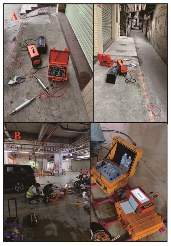 As shown in Figure 3, this survey arranged 2 groups of electrical resistivity tomography survey lines, a total of 5 sections, 1 of which was nearly parallel to G1 and G2 arranged on the side of the road by the pond, with a distance of about 10 m between the 2 survey lines, to detect possible water diversion channels, and the other set of survey lines G3–G5 were laid along the alley along the inside of Tianmeixin village, and the extension direction of the subway was obliquely intersected to detect the overall distribution of karst in the profile. The detection equipment uses the EDGMD-60 electrical resistivity tomography measurement system developed by Chongqing Dingfeng Geological Exploration Instrument Co., Ltd. (Chongqing, China), and the basic composition of the equipment is shown in Figure 4A. Five measuring lines use 96 measuring electrodes, the electrode spacing is 2 m, the measuring line length is 192 m; due to the limitation of the surface cement pavement, detection using clay-wrapped non-polarized electrodes is used instead of copper electrodes. Before the measurement of the whole circuit of each electrode on and off and grounding resistance tests, the electrode that does not meet the standard is poured with salt water and undergoes electric drilling to increase the buried depth and other treatment to reduce noise. The power supply voltage is 400 V during detection, and the Wenner measuring device is used for data acquisition, with a minimum isolation factor of 1, a maximum isolation factor of 31, a maximum measurement depth of 62 m, and 1584 data points for each profile.