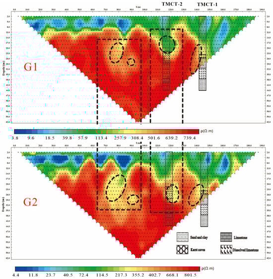 In the section TMCT 1–TMCT 2, the wave velocity within the soil layer is less than 2000 m/s, while the maximum wave velocity in the bedrock region reaches approximately 4500 m/s. The geotechnical interface is situated at a depth of approximately 27 m. Numerous low-velocity anomalies are observed between the two boreholes. Specifically, low-velocity zones identified during drilling at depths of 29–33 m and 39–45 m in borehole 1, and 37–39 m in borehole 2, were confirmed to be karst cavities. Additionally, two large-scale interconnected anomalous traps were detected in the central section of the profile at depths of 33–39 m, exhibiting a wave velocity of 1800 m/s, which suggests the presence of bead-like karst cavities. The corollary for the G1–G2 profile of the electrical resistivity tomography method is proved.