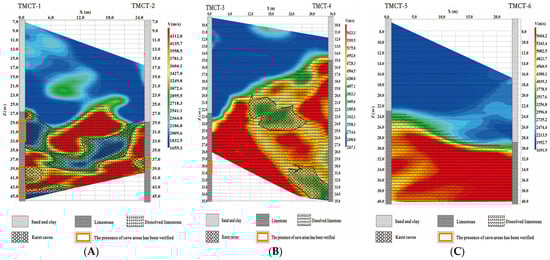 Four karst abnormal areas are found in two sections, which are grouped in pairs and located at 70–90 m and depth 14–29 m in section 1 and 110–140 m and depth 20–32 m in section 2, respectively. At the same time, the similarity of the karst low-velocity anomaly in the two sections proves that the karst is connected in the south–north direction, and it is inferred that the karst has two potential water conduction channels, which make the groundwater flow northward and control the karst development in Tianmeixin village. TMCT 1 and TMCT 2 are located in the middle of the two sections at 118 m and 143 m of the survey line, which verifies the existence of a karst area in the east of the section (Drilling results will be discussed in Section 3.2).