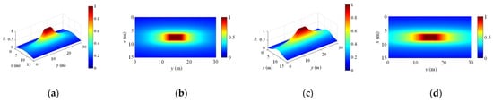 Spatial morphology of risk arising from an individual moving vehicle: (a) risk arising from individual moving vehicle ( = 5 m/s, = 0); (b) risk arising from individual moving vehicle ( = 5 m/s, = 0, top view); (c) risk arising from individual moving vehicle ( = 10 m/s, = 0); and (d) risk arising from individual moving vehicle ( = 10 m/s, = 0, top view).