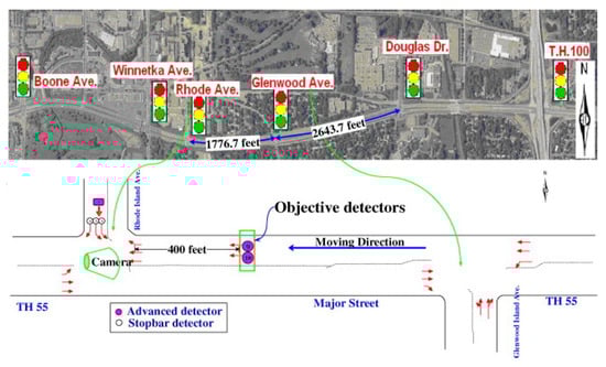 We used 2303 yellow phase-approaching cases extracted from high-resolution event-based data collected at six intersections along Trunk Highway 55 in the Twin Cities area, as shown in Figure 3. The data were gathered using the SMART-SIGNAL system developed by the University of Minnesota, which continuously records vehicle detector actuations and signal phase changes [,]. The cases were investigated from west to east in the direction of the particular phase, in which the green phase time is 110 s, yellow phase time is 5.5 s, and the total cycle length is 210 s, including detailed timestamps of vehicle arrivals at the stop line after yellow onset. The data did not include information on the speed limit at the intersection entrance or on the upstream road segment. However, analysis of the 2303 cases shows that the approach speeds follow a normal distribution, with a mean of 22.94 m/s and a standard deviation of 3.57 m/s and values ranging from 6.40 m/s to 29.92 m/s. The acceleration data also follow a normal distribution, with a mean of 0.61 m/s2, a standard deviation of 1.41 m/s2, and a range from −7.92 m/s2 to 3.93 m/s2. Among the cases, 1833 involved accelerations through the intersection, while 470 involved decelerations.