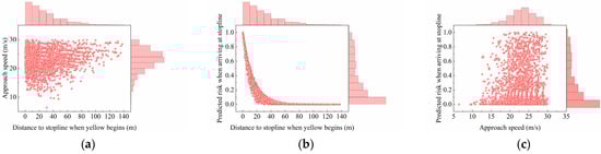 Distributional relationships among three factors: (a) approach speed vs. distance to stop line; (b) predicted risk vs. distance to stop line; and (c) predicted risk vs. approach speed.