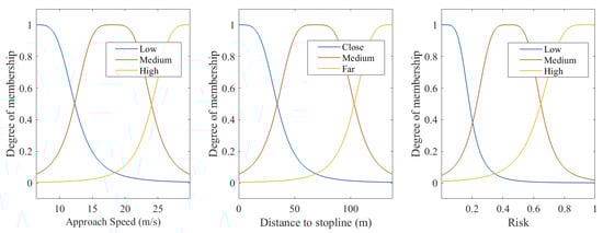 Fuzzy decision-making theory is intended to handle decision-making problems characterized by uncertainty, vagueness, and subjectivity. It has been effectively applied to the modeling of driving behavior [,,]. When the leading vehicle approaches a signalized intersection during the yellow light phase, a decision must be made whether to proceed or stop. In our previously developed risk-perception-based model, each driver’s desired risk was assumed to be a fixed value. However, this assumption overlooks the inherent uncertainty influenced by various factors, such as individual personality traits and road environment conditions. Therefore, in this study, we improve the model by incorporating fuzzy decision-making based on the distance to the stop line, current speed, and perceived risk of the traffic signal. For following vehicles, which are not responsible for leading decisions, their motion decisions are simplified by considering only the perceived risk induced by the preceding vehicle.