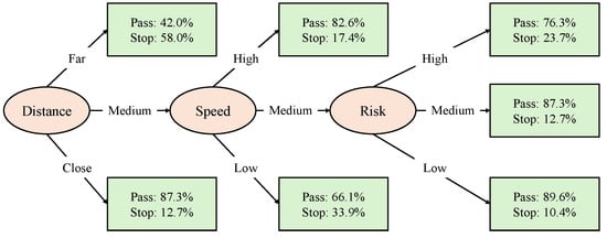 Based on the 2303 yellow phase-approaching cases, membership functions for the three input factors were constructed, as shown in Figure 5. Subsequently, through fuzzy inference and defuzzification (the principles and procedures for creating fuzzy rules are not elaborated here), a fuzzy decision tree representing driver behavior during the yellow phase was developed, as illustrated in Figure 6. The output of the model is the probability of passing or not passing the stop line. An overall prediction accuracy of 80% was achieved for classifying pass and no-pass decisions. Accordingly, we characterize the driver’s behavior approaching intersections during the yellow phase through the lens of risk perception and fuzzy decision-making, without limiting the analysis to whether the vehicle was located within the dilemma zone.