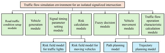 The simulation environment primarily includes modules for road traffic condition setup, vehicle generation, signal timing parameter settings, risk calculation, fuzzy decision-making, vehicle movement, and traffic flow operation characteristic calculation.