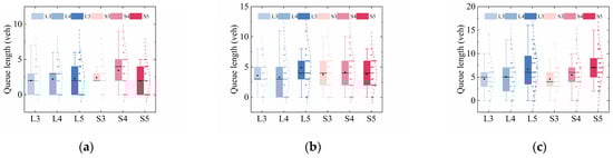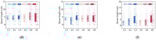 Under conditions where λ is set to 0.2 veh/s, 0.3 veh/s, and 0.4 veh/s, with Vmax of 60 km/h, the simulated queue lengths for left-turn and straight lanes per signal cycle with ty of 3 s, 4 s, and 5 s, corresponding to Groups 1, 2, and 3, are shown in Figure 8a–c. Similarly, under conditions where Vmax is set to 50 km/h, 60 km/h, and 70 km/h and λ is 0.3 veh/s, the statistical results for queue lengths in left-turn and straight lanes per signal cycle with ty of 3 s, 4 s, and 5 s, corresponding to Groups 4, 5, and 6, are shown in Figure 8d–f. As the simulation includes 30 signal cycles, each box plot contains 30 data points with each representing the queue length (veh) within an individual signal cycle.