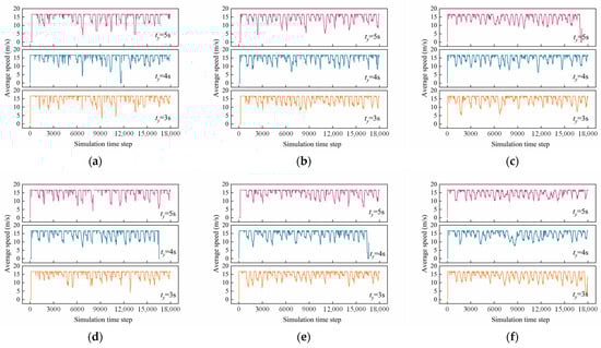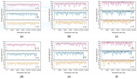Average vehicle speed under different ty (Vmax = 60 km/h): (a) left-turning vehicles, λ = 0.2 veh/s; (b) left-turning vehicles, λ = 0.3 veh/s; (c) left-turning vehicles, λ = 0.4 veh/s; (d) straight-going vehicles, λ = 0.2 veh/s; (e) straight-going vehicles, λ = 0.3 veh/s; and (f) straight-going vehicles, λ = 0.4 veh/s.