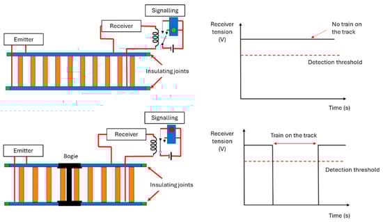 Operating principle of a track circuit and the ideal residual voltage profile. (Top): No train present on the track. (Bottom): Track occupied by an axle, indicating a prohibited passage.