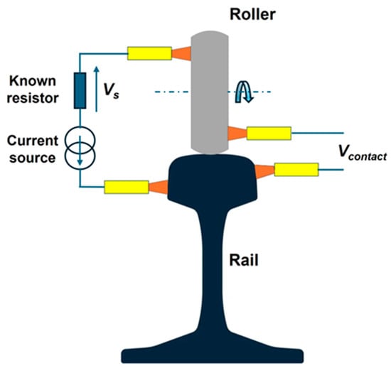 The measurement of the wheel–rail electrical contact resistance is performed using the four-point method, as shown in the diagram in Figure 2, which illustrates the principle of this technique applied to the test bench. Two copper thread brushes are used to inject the current from a source into the contact, while two other brushes, placed closest to the contact, are used to measure the contact voltage. The current flowing through the contact is evaluated by measuring the voltage across a well-known resistor.
