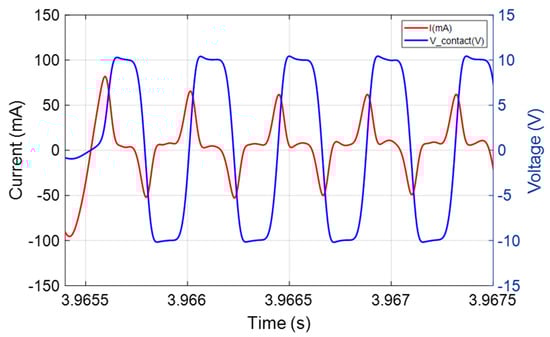 One can notice that the characteristic is nonlinear. As outlined in [], at the outset of a current cycle, the contact resistance is elevated due to the presence of the oxide film at the interface. As the current flows, localized Joule heating raises the temperature at the asperities [], which in turn modifies the oxide layer and lowers its electrical resistivity []. Simultaneously, the hardness of both the steel and oxide diminishes with the increasing temperature []. Together, these factors broaden the real contact zone by causing breaks in the oxide film and compressing asperities, thereby enhancing metal-to-metal contacts.