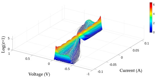 The data is then used to create statistical maps illustrating the current–voltage relationship. The method consists in discretizing the contact voltage and current signals with steps and and estimating the density of occurrence of the different pairs Figure 5 shows an example of this representation: the horizontal axes represent the two parameters and , and the vertical axis represents the density of occurrence, with a color scale where red represents the highest density. This density is expressed in logarithmic scale and corresponds to the number of points obtained in each discretization cell of dimensions . An adjustment of +1 is applied to all occurrence densities to avoid values of zero (for which the logarithm would not be defined).