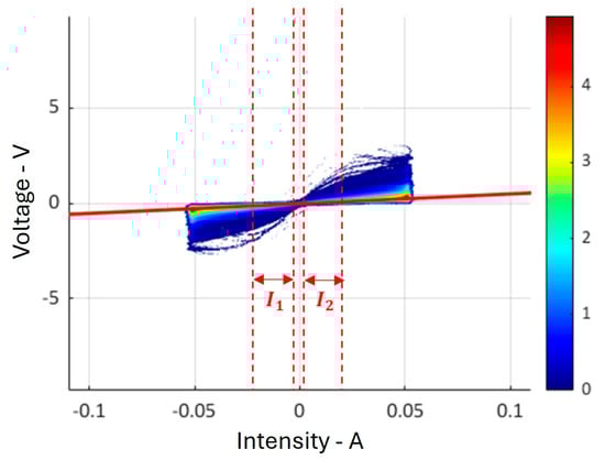 Illustrative example of estimation of the main resistance from the U–I data, illustrated by the thick red line. In the intervals I1= [−21 mA; −5 mA] and I2 = [5 mA; 21 mA], the most frequent (U, I) pairs determine the main resistance, represented by the slope of this line.