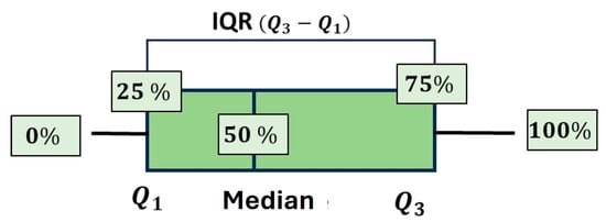 If the roller moves over a long rail section at a speed of we obtain measurements of . Thanks to this large data set, it is possible to evaluate the variations in contact resistance observed during dynamic testing. To this end, statistical analyses have been carried out on this dataset, identifying the median and interquartile range (IQR). The median gives an indication of the central value of the resistance, while the IQR, as shown in Figure 7, is an indicator of the data homogeneity. It is calculated as the difference between the 25th percentile and the 75th percentile of all values. The higher the IQR width, the greater the dispersion of resistances.