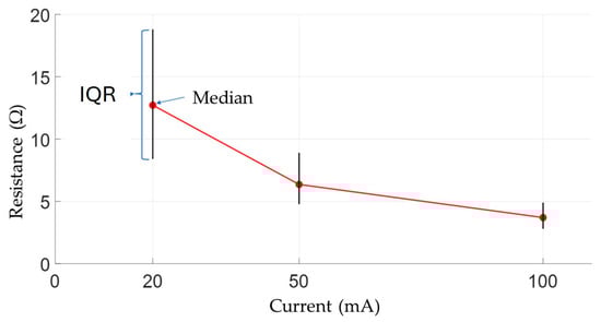 The results of the statistical analysis of instantaneous resistances are shown and plotted against the current in Figure 16. For each zone considered, we calculated the median and interquartile range (IQR) of resistance values R(t) under the different experimental conditions. Several interesting conclusions can be drawn as follows: