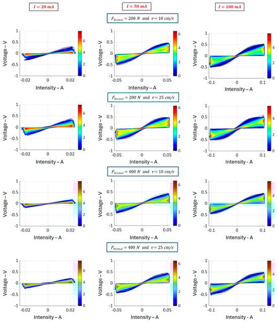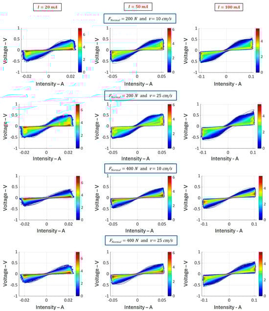 Statistical maps of current–voltage characteristics obtained for the recently cleaned rail, for different current intensities (20 mA, 50 mA, and 100 mA, with f = 2300 Hz), forces (200 N and 400 N), and speeds (10 cm/s and 25 cm/s).