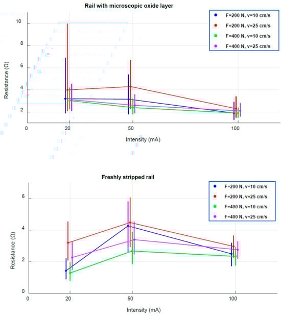 For the recently cleaned rail with a microscopic oxide layer, the effect of current is noticeable: whatever the speed and force applied, IQRs are wider at 20 mA than at 50 mA or 100 mA. The voltage–current characteristics therefore become less dispersed as the current intensity increases. What is more, in most cases, with the exception of , and , the median tends to decrease with the increasing current, and the contact resistance decreases with the increasing force.