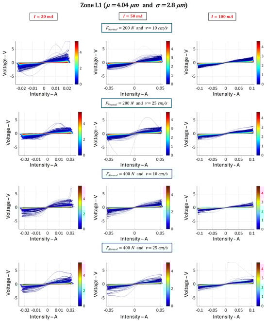 Statistical maps of current–voltage characteristics obtained on zone L1, with an average oxide thickness of 4 μm, for different current intensities (20 mA, 50 mA, and 100 mA, at f = 2300 Hz), forces (200 N and 400 N), and speeds (10 cm/s and 25 cm/s).