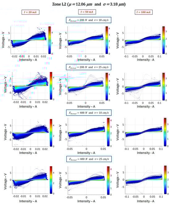 Statistical maps of current–voltage characteristics obtained on zone L2, with average oxide thickness 12.1 μm for different current intensities (20 mA, 50 mA, and 100 mA, at f = 2300 Hz), forces (200 N and 400 N), and speeds (10 cm/s and 25 cm/s).