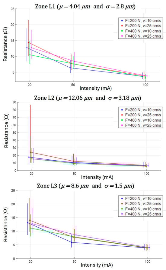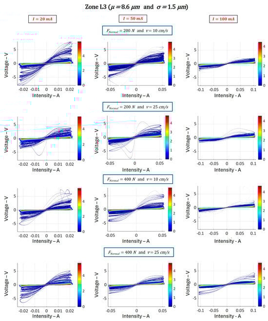 Statistical maps of current–voltage characteristics obtained on the L3 zone, with an average oxide thickness of 8.6 μm, for different current intensities (20 mA, 50 mA, and 100 mA, at f = 2300 Hz), forces (200 N and 400 N), and speeds (10 cm/s and 25 cm/s).