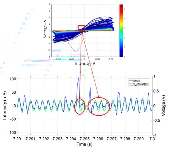 Anomalies can be observed in certain maps. An example is shown in Figure 15 (upper part, red box). This map corresponds to measurements obtained in zone L3 with a current intensity of 20 mA at a force of 200 N and a speed of 10 cm/s. It shows the presence of certain pairs of points (U, I) in quadrants 2 and 4. This means that there are situations where the current I is positive while the voltage U is negative, or vice versa. These singularities could be explained either by the presence of noise in the signal, as shown by the chronograms presented in the lower part of Figure 15 (circled in red), or by the existence of a significant phase shift between I and U. Such anomalies remain relatively infrequent in relation to the total number of periods considered.