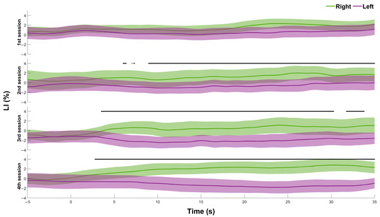 Time course of the lateralization index (LI) across the different sessions in response to right (green) and left (violet) cues. The black line indicates the significant difference between the two curves at each time point. Curves represent the average, and the colored band indicates the standard deviation for the subjects (n = 14). Note that the separation between curves progressively increases in subsequent sessions.