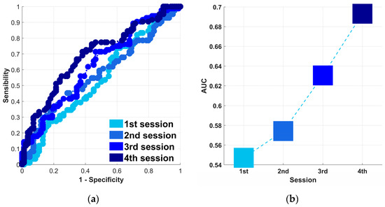 (a) Receiver operating characteristic (ROC) curves related to the binary (left/right) classification of the responses from all subjects in each session; (b) value of the area under the curve (AUC) for ROC in each session, as an indicator of the effectiveness of left/right discrimination. The different colors indicate the different sessions.