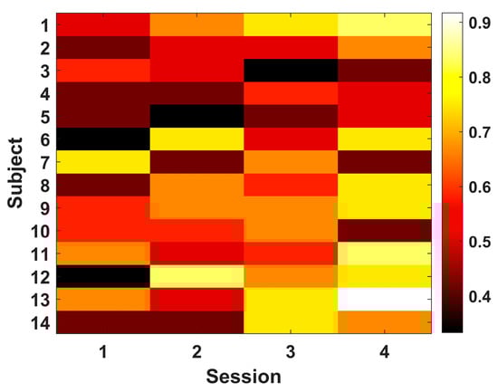 The accuracy of the left/right classification when adopting the optimal threshold was distinctly analyzed in all subjects. The results presented in Figure 4 show the inter-individual variability across the four sessions. It can be observed that there is a tendency towards improvement (yellow-white color) with increased training.