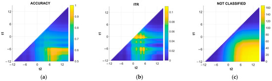 Results of the three-class classification based on adopting two thresholds for the lateralization index (LI). For each pair of thresholds, t1 and t2 varied through the maximum and minimum values of the LI, and the accuracy (a), information transfer rate (ITR) (b), and number of unclassified responses (c) are calculated.