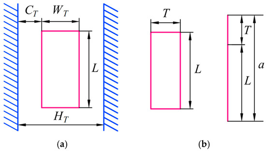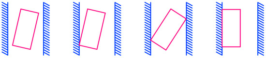 The clearance model for prismatic joints, as illustrated in Figure 2. The length, width, and thickness of the slider are denoted as L, , and T, respectively, while the distance between the two sides of the guideway is . The variable a represents half perimeter of rectangular contact surface of slider, and is given by . The clearance value for the prismatic joint is denoted as , and its expression is as follows: