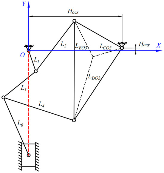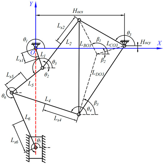 The schematic structure of planar eight-bar mechanism is illustrated in Figure 6. The red dotted line indicates the objects at the same vertical position in the Y-axis direction. Mechanism including a crank 1 (L1), triplex member 3 (), connecting rods 2 (L2), 4 (L4), 5 (L5), and 6 (L6), a slider 7, and a frame 8. Crank 1 is the active member, and the slider undergoes reciprocal linear motion within a guideway.