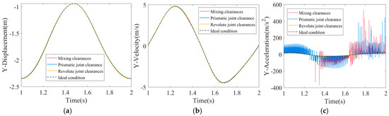 Unlike conventional Newton–Euler, Lagrange, and finite element methods, hybrid clearance modeling transcends the limitation of investigating single kinematic pair clearance effects on specific mechanisms. Instead, it adopts a holistic perspective of multilink mechanical systems to comprehensively analyze complex dynamic responses arising from simultaneous existence of revolute and prismatic joint clearances, including impacts on system dynamic accuracy, stability, and reliability. In contrast, the Newton–Euler method primarily focuses on motion discrepancies in specific mechanisms with particular clearances, the Lagrange approach struggles when handling complex dynamic problems involving multiple kinematic pairs and clearance couplings, and the finite element method mainly concentrates on local structural characteristics, making it difficult to thoroughly analyze the system’s overall dynamic behavior. The increased complexity of hybrid clearance modeling stems from the compound effects of combined revolute and prismatic clearances, which introduce intricate dynamic interactions and strong coupling characteristics among various clearances. Moreover, to accurately evaluate key performance indicators of mechanical systems, the constructed model must maintain high precision and reliability, necessitating precise simulation of multiple influencing factors—a requirement that further escalates modeling difficulty. Consequently, the analytical framework established in this study holds both innovative and practical significance.