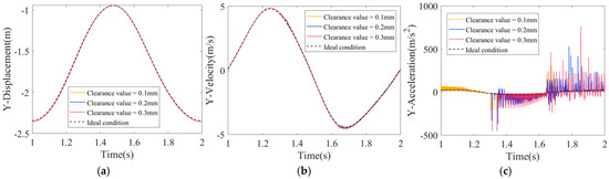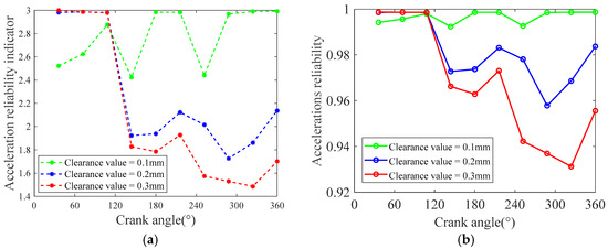 This subsection investigates impact of clearance values on dynamic precision reliability of mechanisms with clearances. Friction coefficient at clearance is set to 0.2, driving speed is uniformly 60 rpm. Clearance values are taken as 0.1 mm, 0.2 mm, and 0.3 mm, respectively. Displacement and velocity curves do not change much due to the effect of the clearance, so the selection phenomenon is more intuitively accelerated. The reliability indices and reliability of slider acceleration are illustrated in Figure 27.