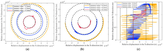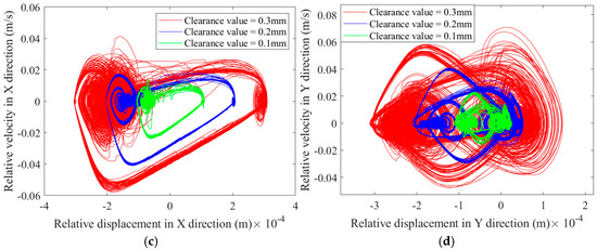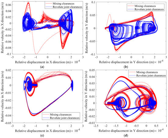 As shown in Figure 17, Figure 18, Figure 19 and Figure 20, phase portraits and Poincaré maps at rotating pair clearance , rotating pair clearance , and prismatic pair clearance F reveal that with the rise in clearance values, the scope of the phase portraits and the Poincaré maps expands, the scattering degree of the mapped points rises, resulting in a more pronounced chaotic phenomenon. Under different clearance values, the phase trajectories in the X and Y direction phase diagrams of revolute pair , revolute pair , and prismatic pair F, spanning horizontal and vertical regions, are presented in Table 5.