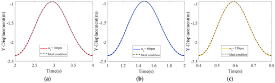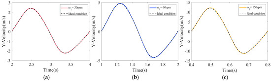 From Figure 21, which depicts the phase portraits at revolute joints and , it is seen that as the drive velocity rise from 30 rpm to 60 rpm and further to 150 rpm, the degree of chaos increases, and the chaotic regions expand accordingly. The impact caused by rebound becomes more frequent and intense, and the expanding phase space region means it is becoming increasingly unpredictable, where small disturbances can cause trajectory divergence. Figure 23, showing the Poincaré maps of revolute joints and , reveals that with continuous rise in driving speed, a range of mapped points at these revolute joints expands, indicating an intensification of chaotic phenomena. Based on the observations from these two figures, it is concluded that damage at the revolute joints becomes increasingly severe. Higher speeds inject kinetic energy, causing components to bounce unpredictably in the clearance area. This will excite higher-order vibration modes, leading to complex non periodic motion. Figure 22 presents the phase portrait at prismatic joint F, which indicates that as driving speed increases, a proportion of mapped points in both X and Y directions expands, with a phase portrait in Y direction resembling a circular ring. The Poincaré map at prismatic joint F, shown in Figure 24, demonstrates that the mapped points in the Y direction are relatively concentrated, with many overlapping, especially at driving speeds of 30 rpm and 150 rpm, where the Poincaré maps are solid small circles. Combined with the trajectory of the prismatic joint’s center, it can be inferred that slider undergoes periodic motion as driving speed continuously increases, without an occurrence of chaotic phenomena.