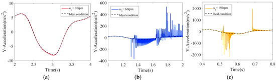 As illustrated in the Figure 28, when driving speeds are 30 rpm, 60 rpm, and 150 rpm, respectively, the corresponding reliability indices of the minimum acceleration of the slider are 2.9985, 1.7258, and −0.0569. The figures also indicate that the reliabilities of the minimum acceleration of slider corresponding to various driving velocities are 0.9986, 0.9578, and 0.4772, respectively. The sharp decline in reliability at higher speeds is driven by inertial effects and reduced time for dynamic stabilization. At 150 rpm, the mechanism’s inertia dominates over joint damping, causing chaotic contact forces and resonance phenomena. This leads to unpredictable acceleration spikes that exceed the failure threshold, significantly increasing the probability of dynamic failure. Therefore, for multilink mechanisms with mixed clearances, higher drive speeds result in less reliable dynamic accuracy of the slider. The acceleration reliability is 0.47, which deviates significantly from the ideal acceleration envisioned, which makes this mechanism almost unsuitable for industrial tasks that require strict acceleration control. When the reliability is below 0.90, design changes are crucial and can be improved by optimizing the mechanism design, introducing speed related damping, or using adaptive control measures.