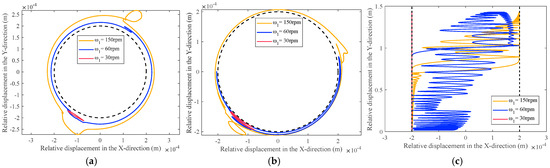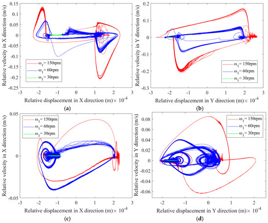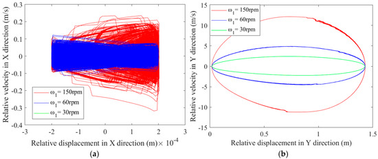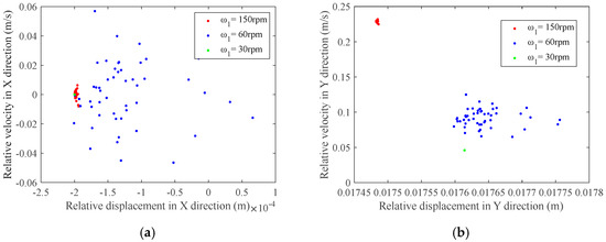 Based on Figure 21 and Figure 22, it is inferred that driving speed has a material impact on multilink mechanism nonlinear characteristics with mixed clearance. With increasing drive speed of crank 1, the area of the phase portrait increases. The phase trajectories of rotation pair , rotation pair , and prismatic pair F across horizontal and vertical regions in the X and Y direction phase diagrams at different driving speeds are shown in Table 6.