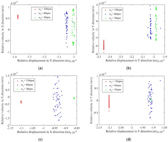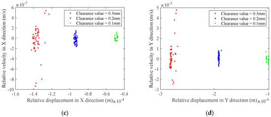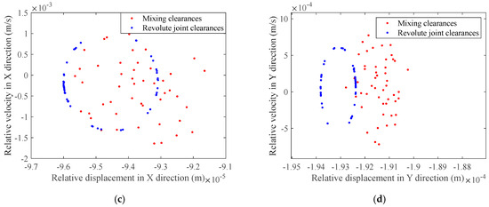 Poincaré map at the clearance of revolute pair: (a) Poincaré map of clearance A1 in the X-direction; (b) Poincaré map of clearance A1 in the Y-direction; (c) Poincaré map of clearance A2 in the X-direction; (d) Poincaré map of clearance A2 in the Y-direction.