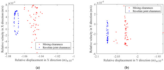 Poincaré map at the clearance of prismatic joint: (a) Poincaré map of clearance F in the X-direction; (b) Poincaré map of clearance F in the Y-direction.