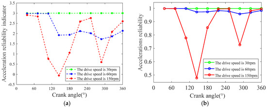 This subsection investigates impact of various drive speeds on dynamic accuracy reliability of multilink mechanisms with mixed clearances. Assuming that clearance values are all 0.2 mm, the driving speeds are set to 30 rpm, 60 rpm, and 150 rpm, respectively. The reliability indices and reliabilities of the slider acceleration are shown in Figure 28.