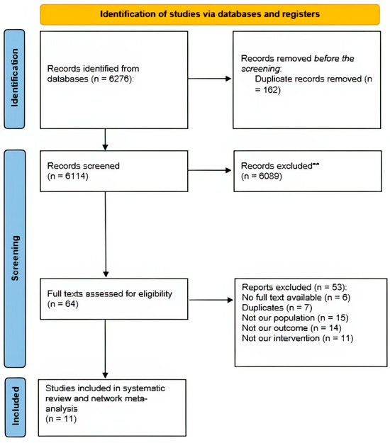 The study selection process is illustrated in Figure 1. The initial search across relevant databases yielded 6276 studies. After removing duplicates, 6114 studies were screened based on title and abstract. Subsequently, 6089 studies were excluded due to irrelevance to the research question. A full-text assessment was conducted for the remaining 84 reports. A further 64 reports were excluded for various reasons: unavailability of full text (n = 6), duplicate publication (n = 7), mismatched intervention (n = 11), irrelevant outcome (n = 14), or inappropriate population (n = 15). Ultimately, 11 studies met the inclusion criteria and were included in the systematic review and meta-analysis. All included studies were retrospective cohorts (Table 1).